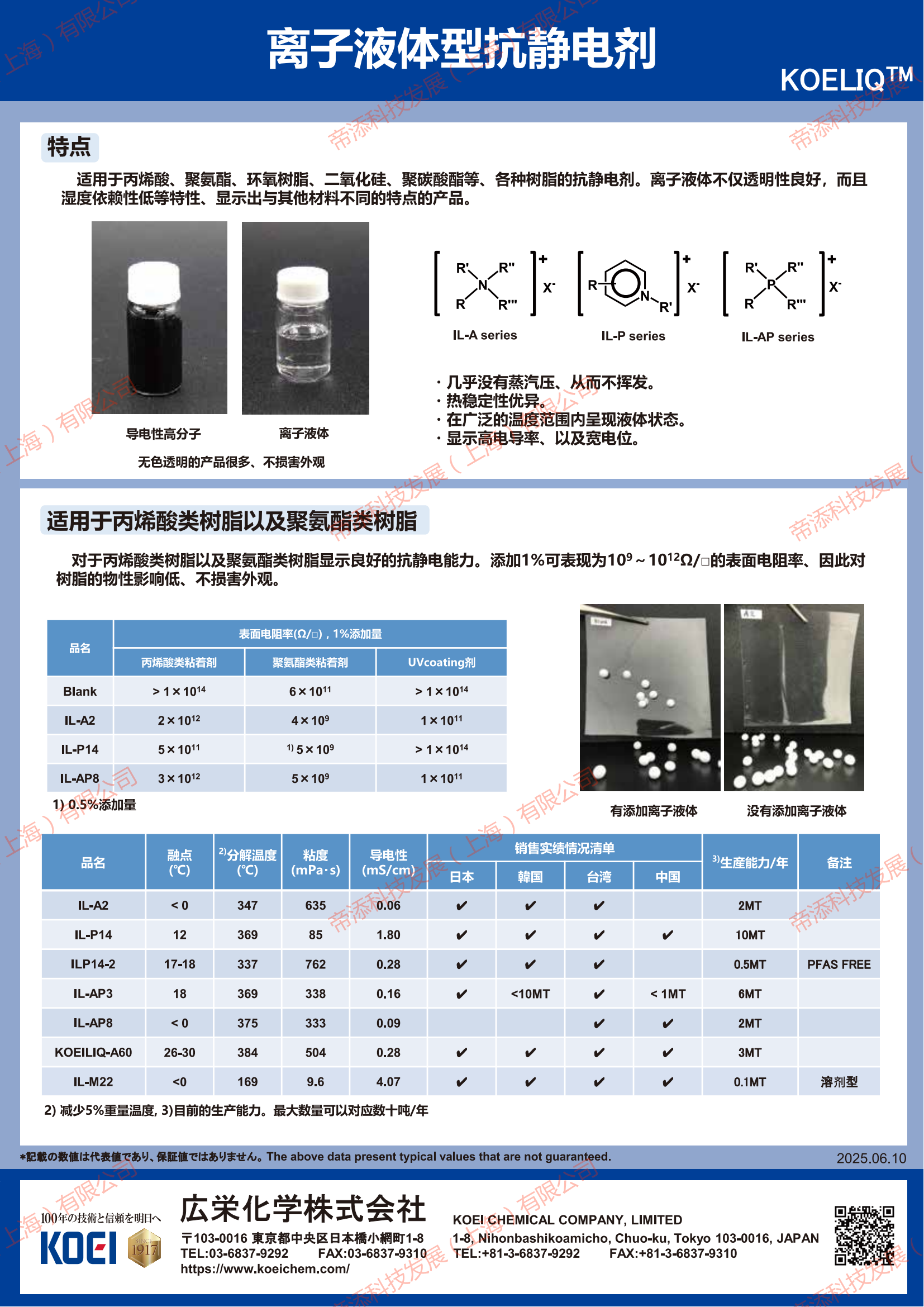 帝添科技KOEI日本廣榮化學(xué)樹(shù)脂添加劑離子液體抗靜電劑導(dǎo)電劑IL-P14等