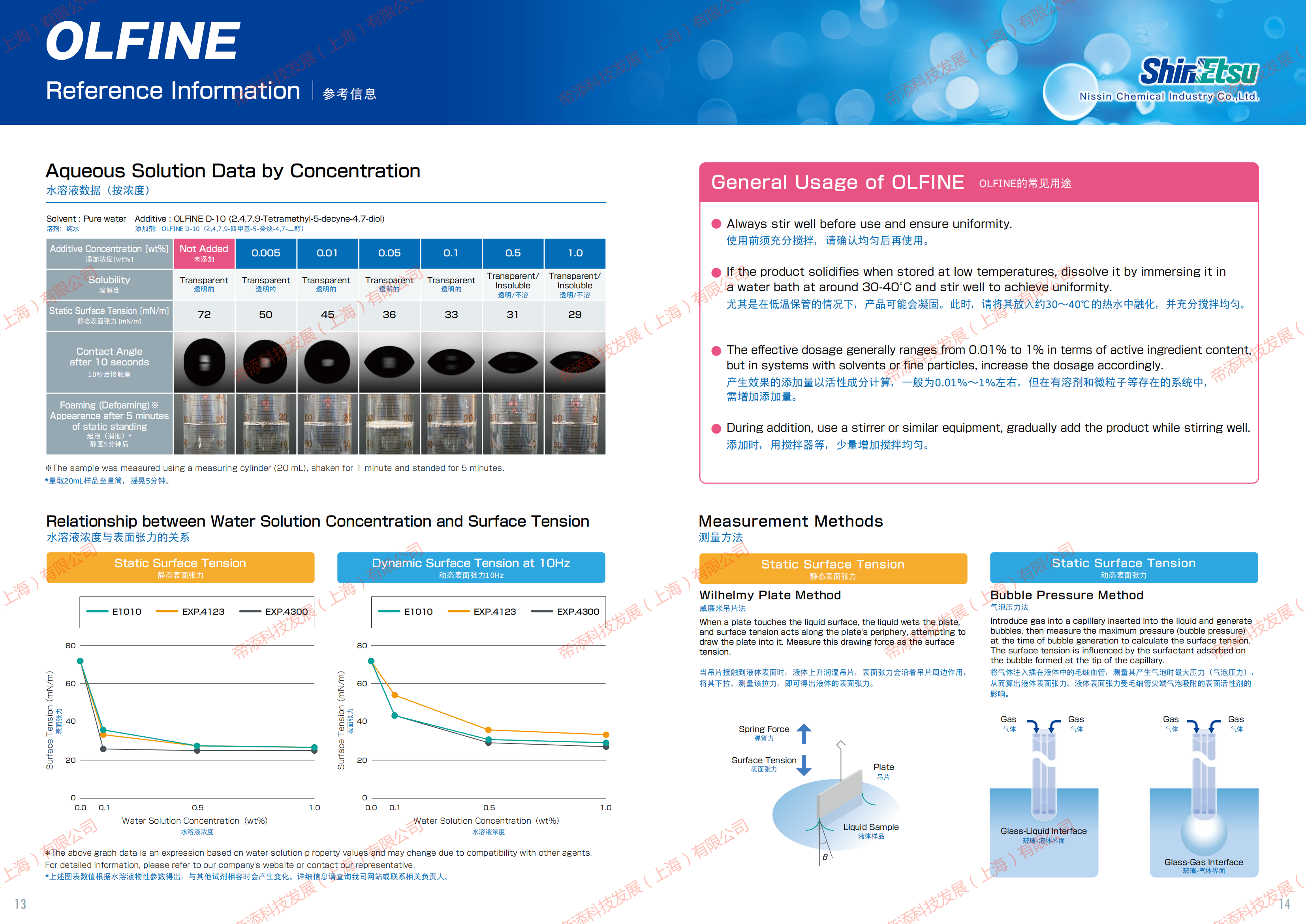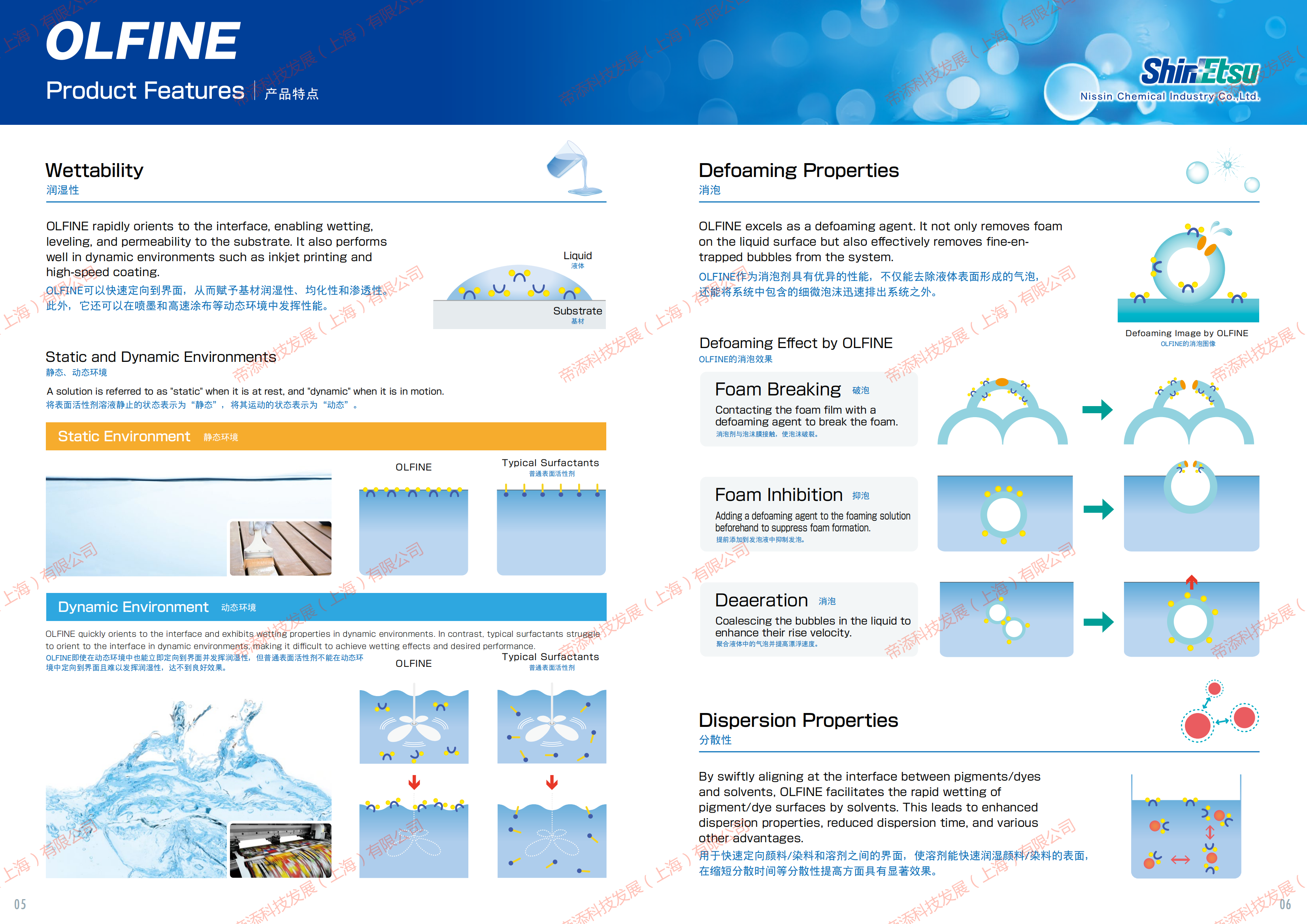 日信化學(xué)表面活性劑OLFINED-10系列,OLFINE E系列,OLFINE EXP系列,OLFINE PD系列,OLFINE WE系列, OLFINE Defoaming 系列等介紹。