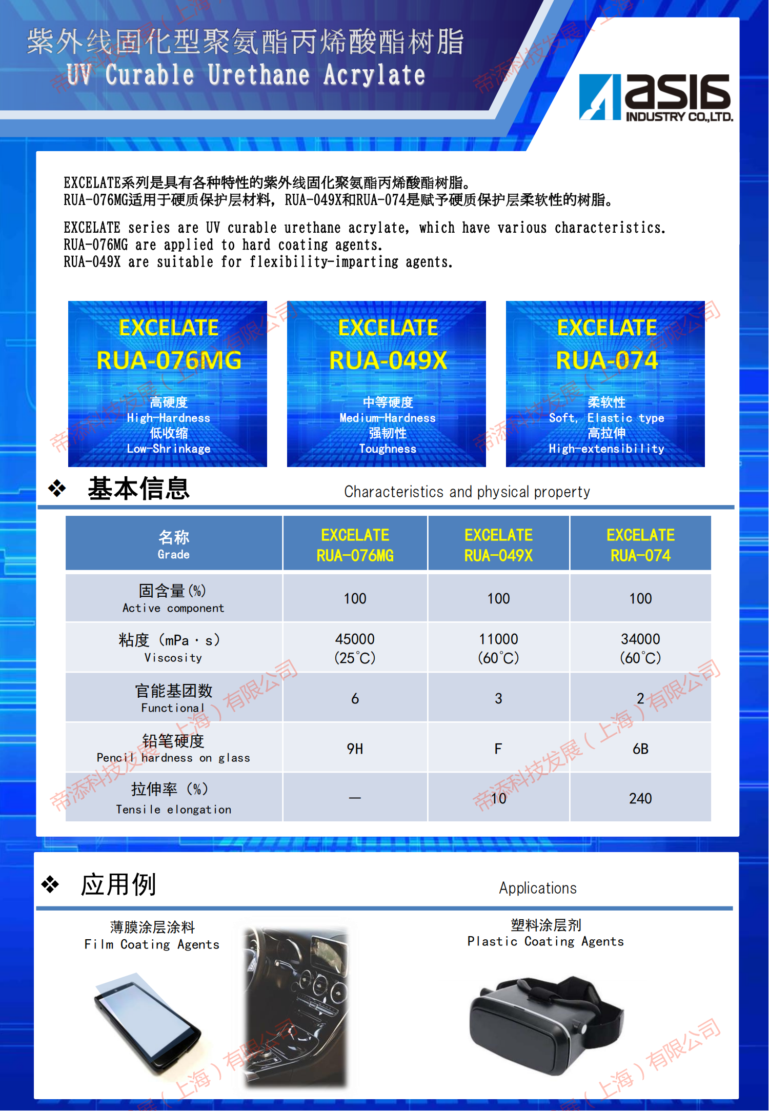 RUA-076MG適用于硬質(zhì)保護(hù)層材料,RUA-049X和RUA-074是賦予硬質(zhì)保護(hù)層柔軟性的樹脂。